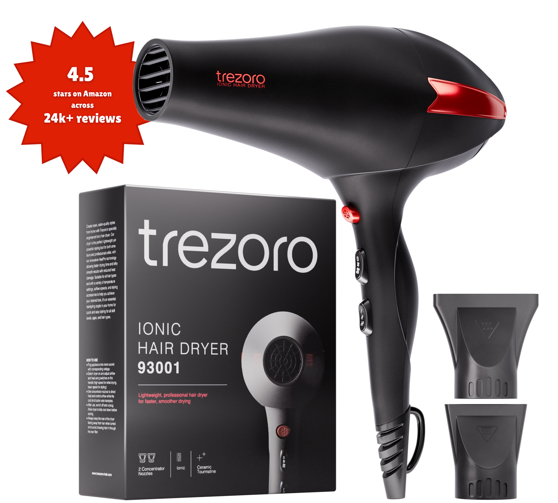 Trezoro's Professional Ionic Hair Dryer efficiently dries and styles your hair. With a powerful 2200W motor, our blow dryer delivers fast and quiet drying while maintaining your hair's health. Our ceramic tourmaline grill and negative ions reduce frizz and maintain natural hair texture. Hair Dryer includes attachments for curly hair. Transform your daily hair routine with our Professional Ionic Hair Dryer!